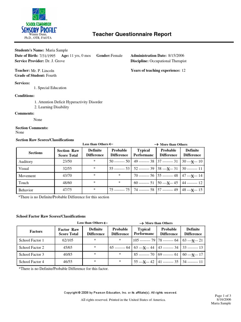 The short sensory profile is a 38 item caregiver questionnaire and score sheet designed for use in screening and research protocols. Teacher questionnaire for students ages 314 years. Caregiver questionnaire for children ages 314 years. The sensorimotor history questionnaire for preschoolers.